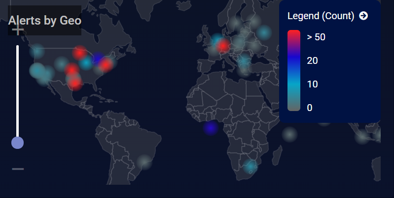 • We configured the chart to display a heatmap based on the source IP addresses of detected alerts. The color-coded geopoints illustrate at a glance where the greatest number of alerts are concentrated based on the legend at the right of the heatmap.