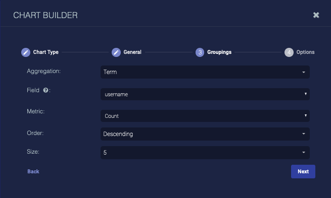 7. Choose the Aggregation. Choose Term to group data by the text in the fields (useful when your data is text, such as tenant names), choose Range to group data by ranges (useful when your data is numeric, such as severity), or choose Filter to define filters for the data groups.