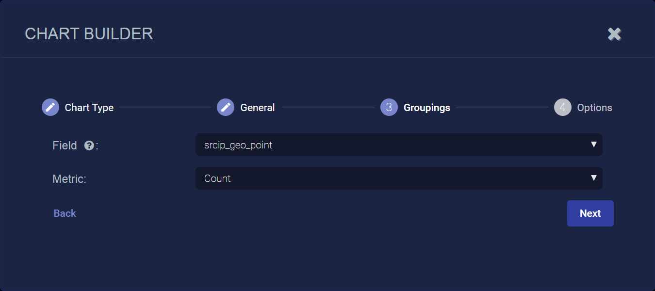 • dst_ip_geopoint – Show heatmap based on destination IP addresses matching the query in the previous steps.