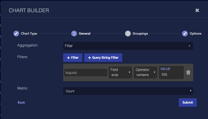 7. Choose the Aggregation. Choose Term to group data by the text in the fields (useful when your data is text, such as tenant names), choose Range to group data by ranges (useful when your data is numeric, such as severity), or choose Filter to define filters for the data groups. The options differ based on your choice. In this example, we illustrate the fields that display when you add a basic filter. Define your aggregation.