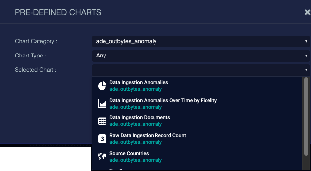 3. Choose a Chart Category to narrow your search. This is not necessary, but we recommend it, as there are many charts, and more are added at each release. In the example above, we enter a field to search for charts that use ade_outbytes_anomaly.