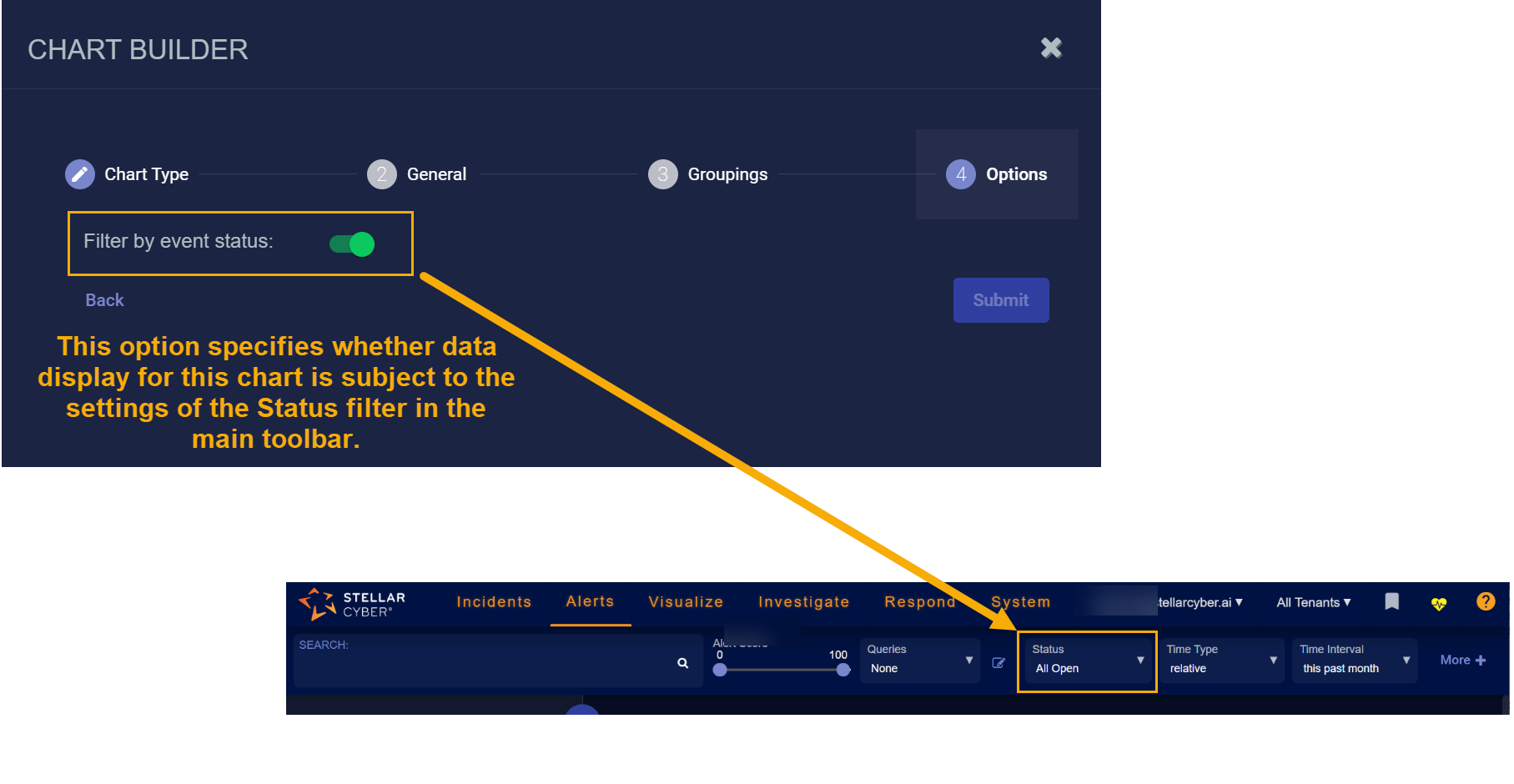 Regardless of the type of chart you are creating, the Chart Builder's last step lets you configure the Filter by event status option. This feature specifies whether data in this chart is subject to the global Status filter available in the main toolbar: