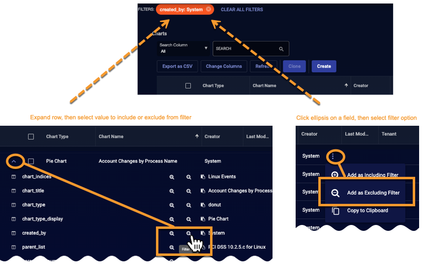 The charts list, like many tables in Stellar Cyber, supports export, sorting, edit, and delete operations. You can use the a couple of options to filter charts based on any of the chart attributes. Expand a row and select the attribute, or click the ellipsis button on a field and then select the filter option