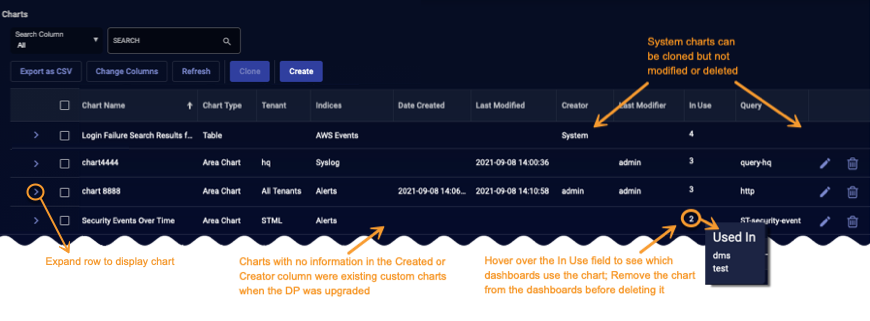 Use the charts list to manage the charts available for display in dashboards throughout the Stellar Cyber product. Note the following:
