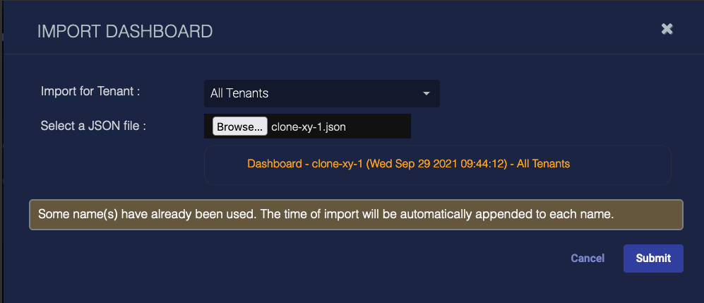If you have duplicate dashboards, charts, or queries in your system, as we do in this example, Stellar Cyber automatically appends the import time to each object's name.