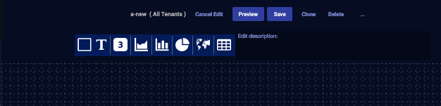 Click Edit. The Edit button becomes the Cancel Edit button. Stellar Cyber changes the dashboard view to the editing canvas with a group of buttons for adding components.