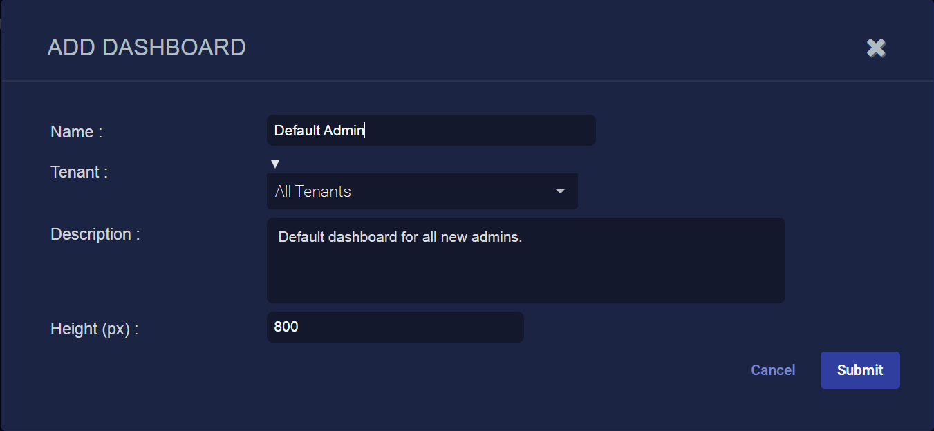 Enter the dashboard name. We entered Default Admin. This field does not support multibyte characters.