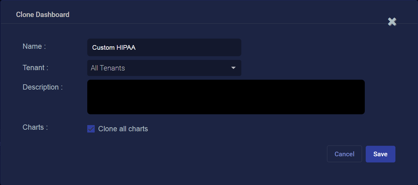 Name the new dashboard. Our new dashboard title is Custom HIPAA. This field does not support multibyte characters.