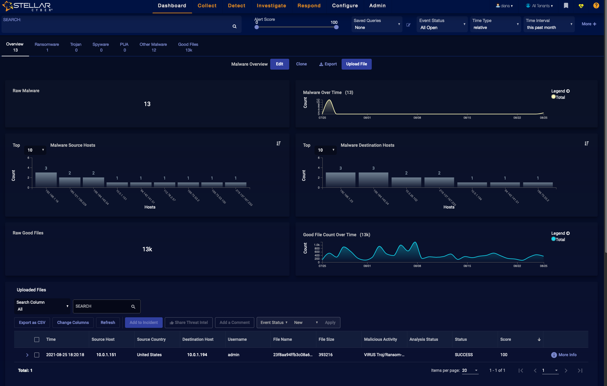 Stellar Cyber sensors can identify malware traveling through the network and arriving at specific hosts. You can use the Visualize | Predefined | Malware Sandbox page to see and analyze these observations. Use the category tabs at the top of this page to filter for specific malware types; the tabs have a count of event records for that category.