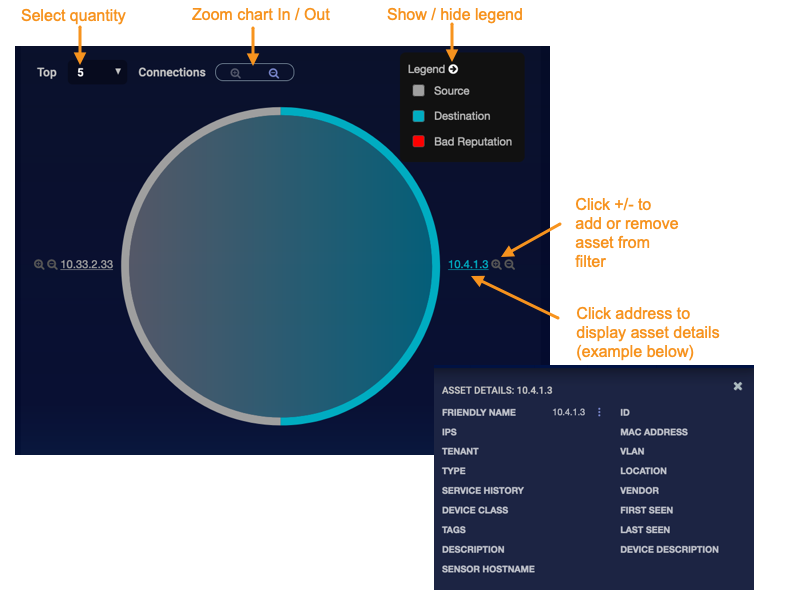 Legend: Illustrates the purpose of the chart colors. Click the white arrow to show or hide the legend. You can click in the body of the chart to filter on one of the legend types (Source, Destination, Bad Reputation)