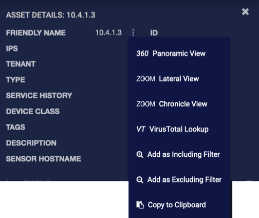 Asset Details: Click the asset label to display more details on the specific asset. From within the displayed dialog, you can perform a set of standard actions using that asset. Click the symbol to display a menu and select your desired action.