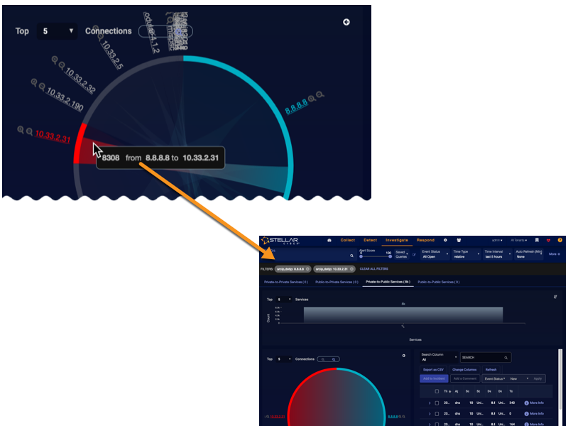 Connection Selection: You can create a quick filter by clicking a chart segment. In the example below, there are more than 8000 connections occurring between the address pair of 8.8.8.8 and 10.33.2.31. Clicking this segment has added a filter to the overall page, as shown below.