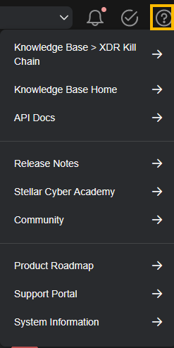 • Click the question mark icon to open a menu that provides access to the documentation and other tools, such as the Stellar Cyber Academy and Support Portal. To view the software version that the Data Processor is running, select the System Information menu item.