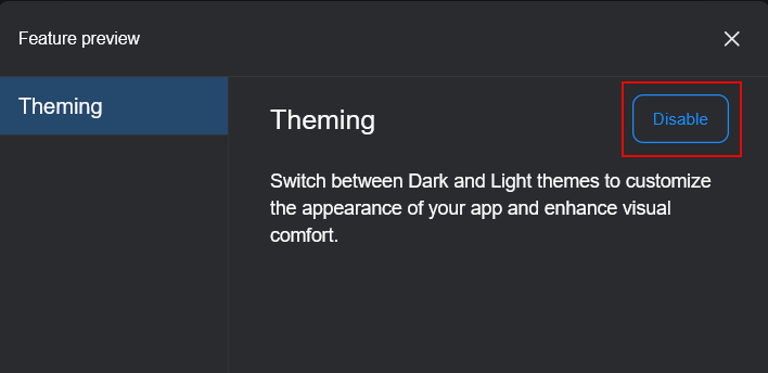 The user interface changes to a Dark theme and Theming changes to Disable.
