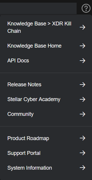 icon to view the menu items: Knowledge Base <specific article>, Knowledge Base Home, API Docs, Release Notes, Stellar Cyber Academy, Community, Product Roadmap, Support Portal, and System Information.