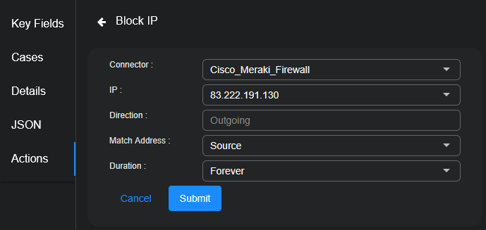 Click Submit. A quarantine on the target is immediately triggered from the SentinelOne service associated with your connector.