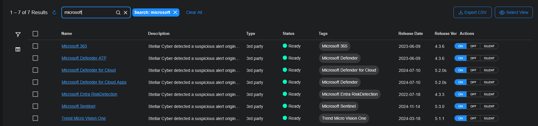 Actions—Actions for 3rd Party Integrations, ML Detections and Rule Based Detections to toggle an alert type ON, OFF, or SILENT.