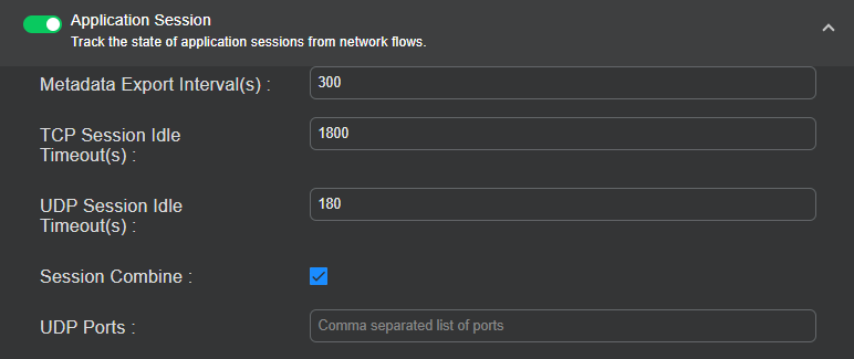 Enable this for the sensor to identify the length of individual network sessions. The parameters specify how often to report the session information, and what length of time to apply when determining that a session has ended.