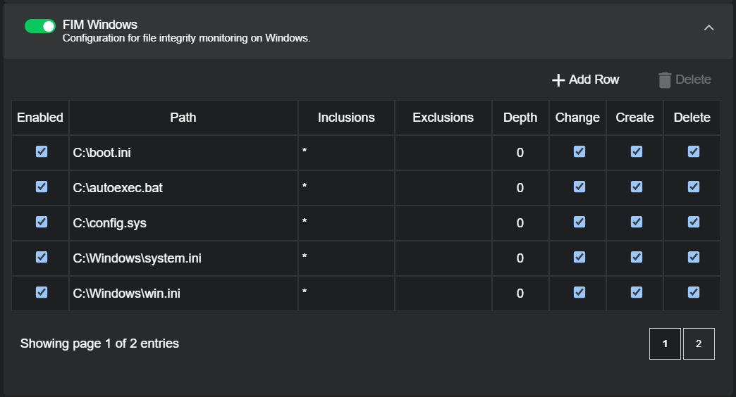 Select + Add Row to add new files and folders to the FIM feature. For each entry in the table, you can configure the following:
