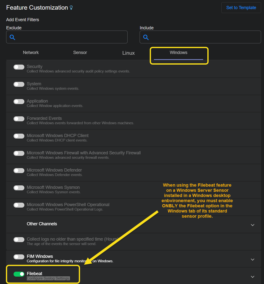 • When using the Filebeat feature on a Server Sensor installed on a Windows desktop, enable only the Filebeat option in the Windows tab in the Standard Sensor Profile. All other options must be disabled, as illustrated below: