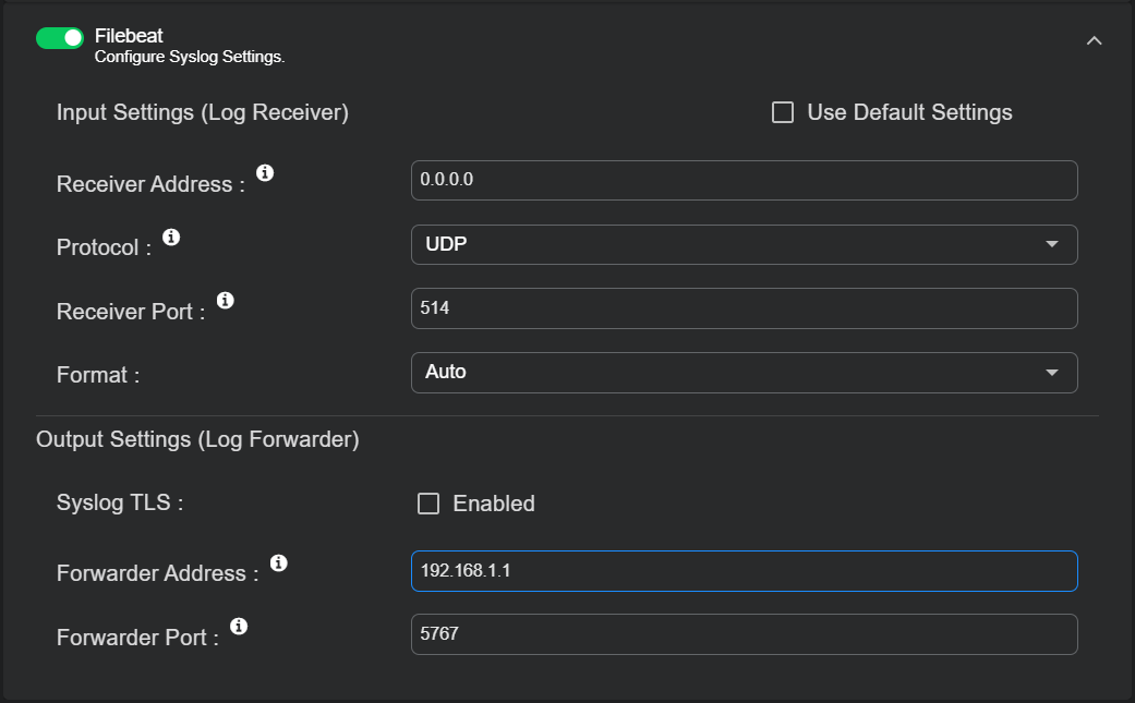 Once you enable Filebeat, new options appear that let you configure both Input and Outputsettings for the syslog forwarding feature.