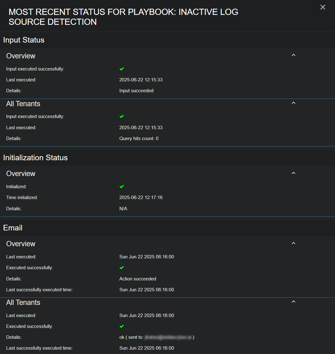 • Select and Last Status to see the results of the last time the playbook ran, including the email address where any email notifications were sent. The screen is similar to the following.