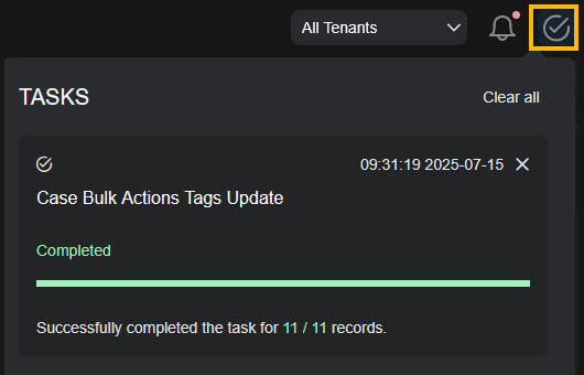 icon to open Tasks to keep track of the progress, success, or failure of ongoing Stellar Cyber activities (bulk actions to Cases, asset edits, and so on). Depending on the amount of data affected by an action, it make take a few seconds for some actions to complete. The Task List is useful in these situations, letting you see the progress of the action. Here's how you display the Task List, complete with some successful bulk actions:You can clear individual tasks from the Task List using the standard close button (X) at the upper right of their entries in the list. Clear all of the tasks using the Clear all button at the top of the list.