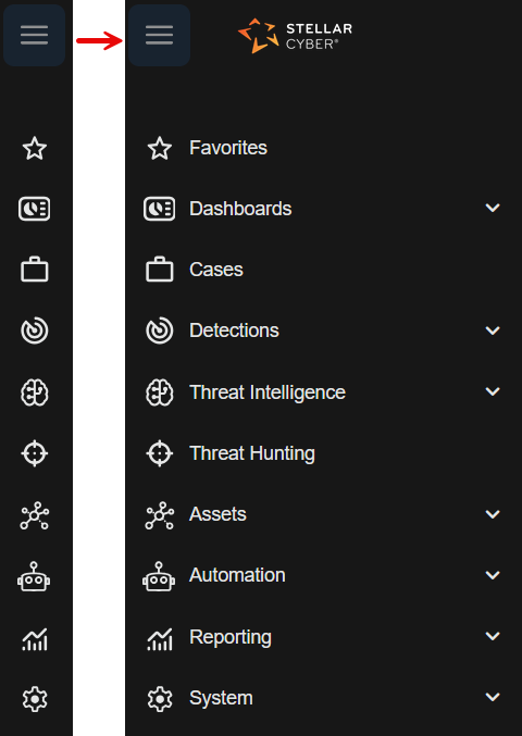 icon to expand the icons into text menus to navigate to any function in Stellar Cyber.