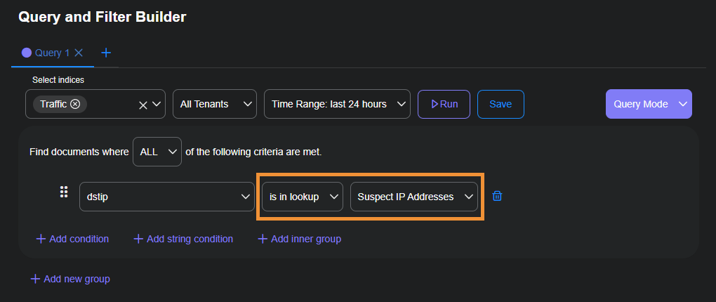This lookups feature (System | Saved Objects | Lookups) allows you to centrally create and manage lists of IP addresses, text strings, dates, or numbers for conditional matching in queries and alert filters that you create and edit in any of the query and alert filter builder tools such as: