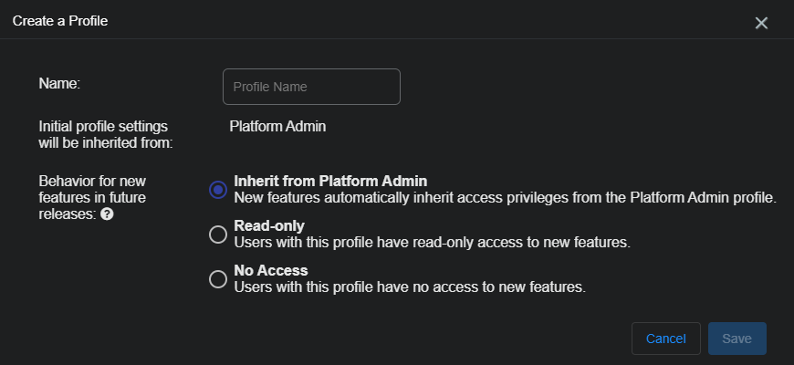 These options define how this profile manages the privileges for features added to Stellar Cyber in the future. The options are: