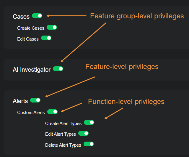 You can define access privileges globally and at the feature group, feature, and function levels. To define privileges, simply toggle privileges on or off.