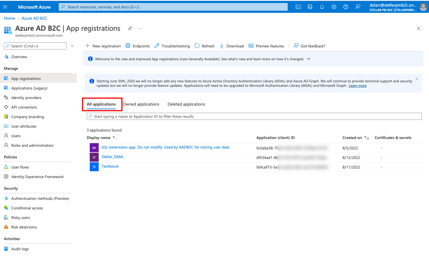 3. Select the application named: b2c-extensions-app. Do not modify. Used by AADB2C for storing user data.
