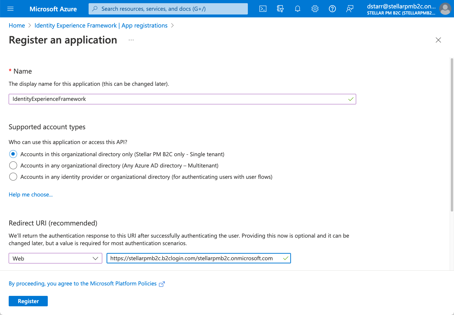 If you stop and return to any of the procedures in this configuration process, ensure that you switch to the correct directory before you continue so that you are working on the correct Azure AD B2C Tenant container.