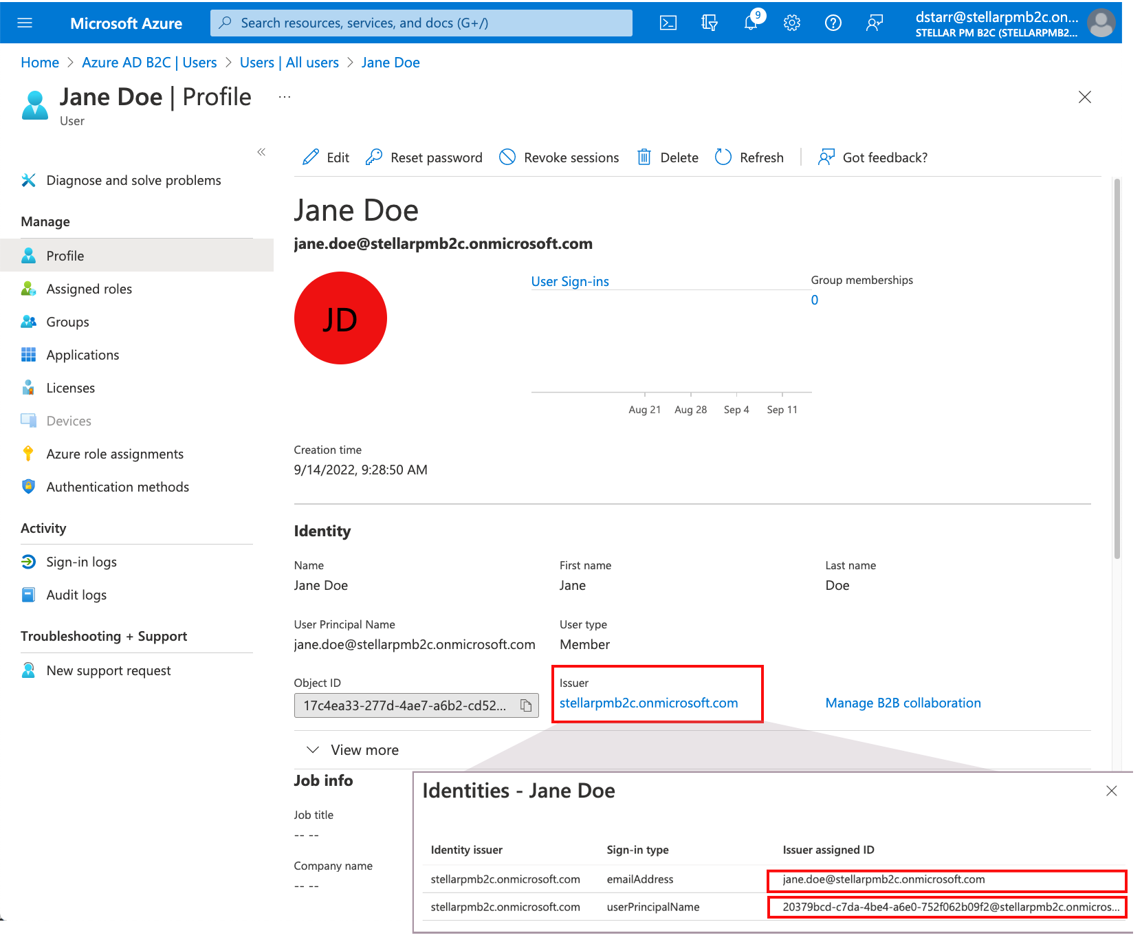 Azure AD B2C does not provide a GUI-based mechanism to modify the attribute values. This procedure uses Microsoft Graph Explorer to edit and validate the attributes.