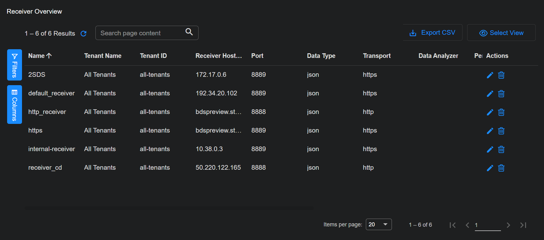 Click System | DATA SOURCE MANAGEMENT | Receivers to see a list of the configured receivers.