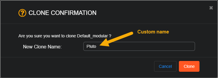 If you clone a single sensor profile, you can supply your own name for the cloned profile in the dialog box that appears. For example, in the illustration below, we've cloned the Default_modular sensor profile and given it the custom name of Pluto: