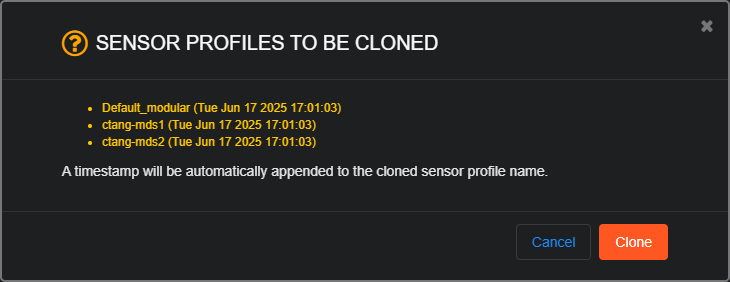 You can clone sensor profiles by checking their boxes in the Sensor Profiles list and clicking the Clone button. By default, cloned sensor profiles are given the same name as the source profile plus a timestamp indicating the time when the profile was cloned – for example, if you clone Pluto, it might become Pluto (Tue Jun 21 2022 13:12:24).