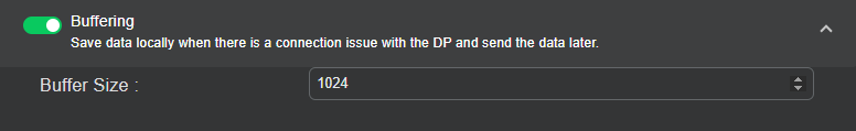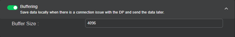 Enable this to enable buffering on the data sensors. If you enable buffering, the data sensor buffers the logs sent to Stellar Cyber. If the logs are received successfully, the sensor deletes the buffered logs. If the buffer is full, the sensor stops buffering logs. The Buffer Size parameter lets you specify the maximum size for all logs buffered: