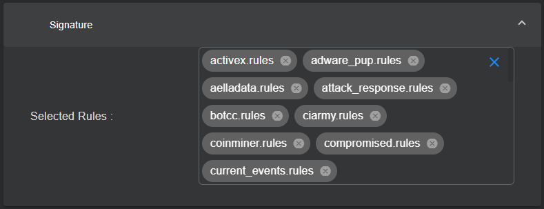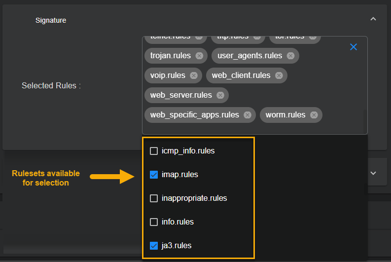 Stellar Cyber regularly pushes new rule sets so that they are available for selection in a sensor profile. Click at the bottom of the Selected Rules list to see a dropdown of the rules available for selection. For example: