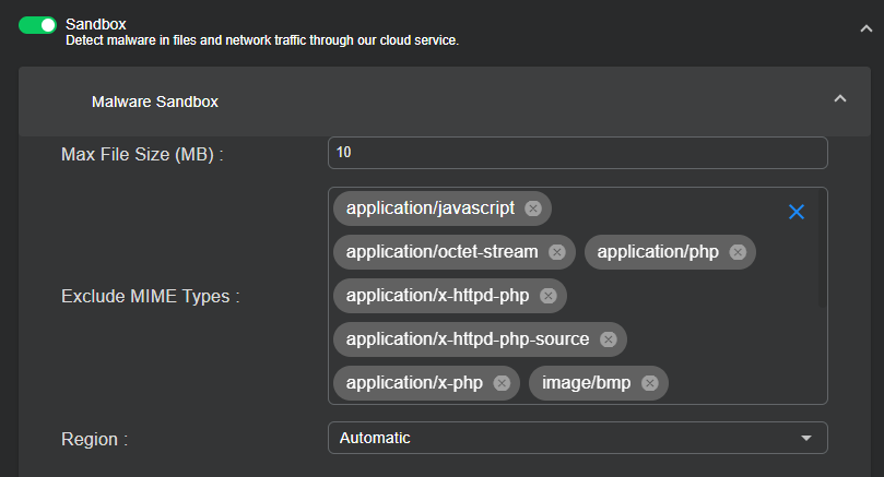 Region – Choose the geographical region of the malware sandbox used by this profile. By default, this option is set to Automatic and the sensor chooses the sandbox with the lowest latency relative to its own location. You can optionally override the Automatic option and choose a sandbox in a specific geographic location from the dropdown list.