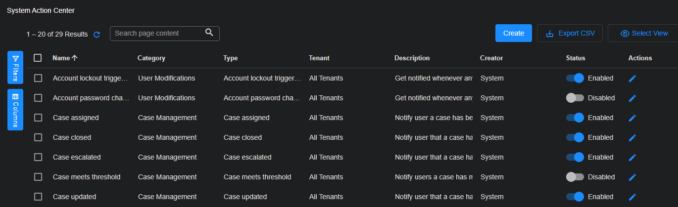The System Action Center lists each of the defined system action rules in a standard Stellar Cyber table, as shown below.