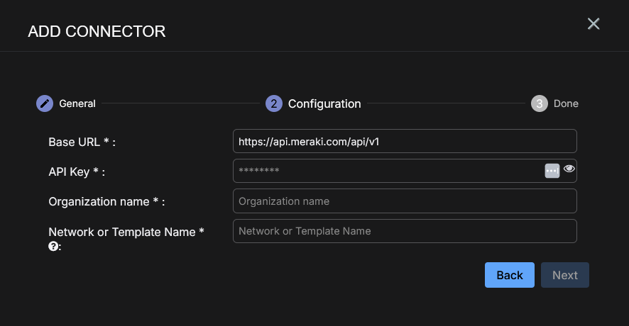 • Base URL, API Key, Organization Name, and Network or Template Name