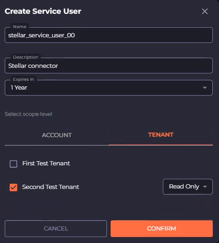 3. In the Create Service User dialog, enter a name and description, and select an expiry, such as 6 months or 1 year.