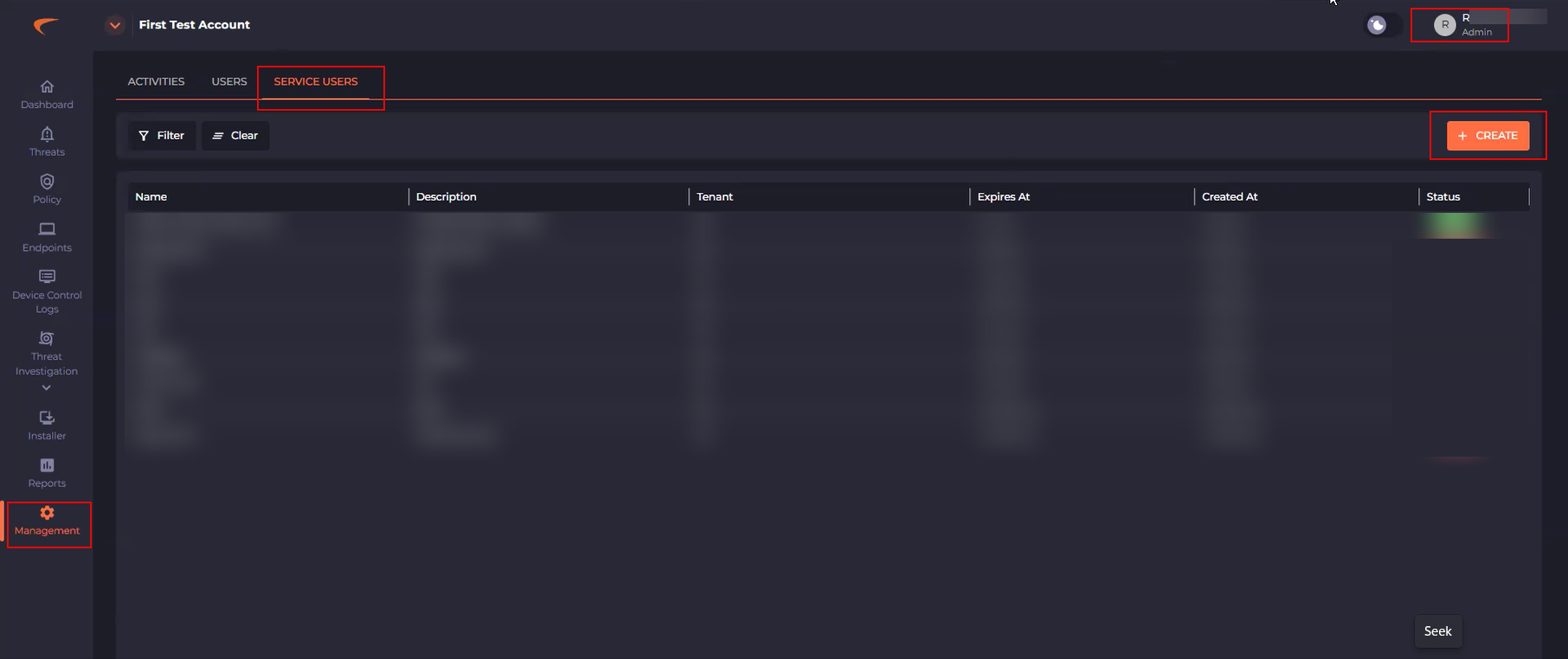 2. Click Management, click SERVICE USERS, and then click CREATE.