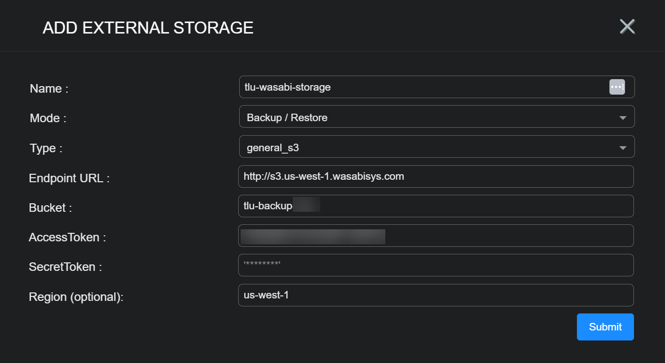 You can configure General S3 external storage locations for backup/restore. A General S3 external storage location uses an AWS S3-Compatible Storage Service for its storage (for example, wasabi or MinIO). You must configure a General S3 external storage location before you can use it for backup/restore in Stellar Cyber.