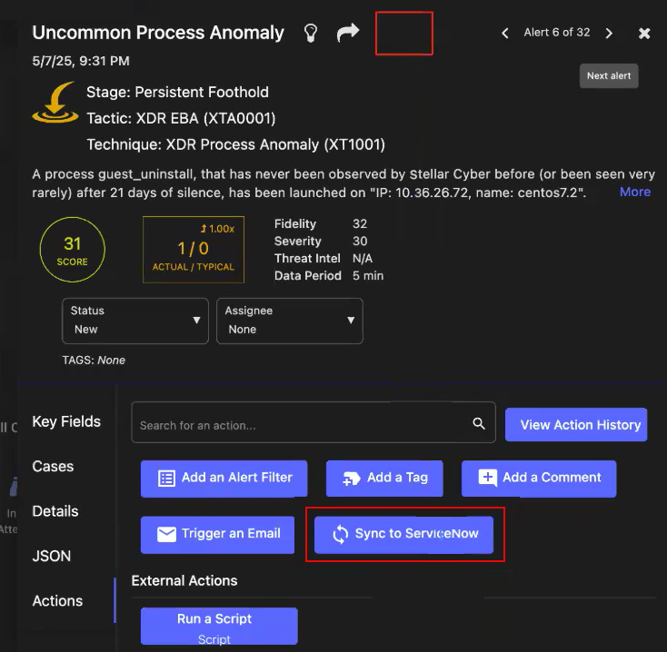 You can manually synchronize an alert or a case if it cannot be synchronized automatically. The single alert or case can be pushed manually to the existing ServiceNow integrations using a Sync to ServiceNow button. This button provides a way to manually synchronize an alert or a case from Stellar Cyber to create a ServiceNow ticket with a single button push. This action will ensure the alert or case is immediately pushed to ServiceNow and linked appropriately.