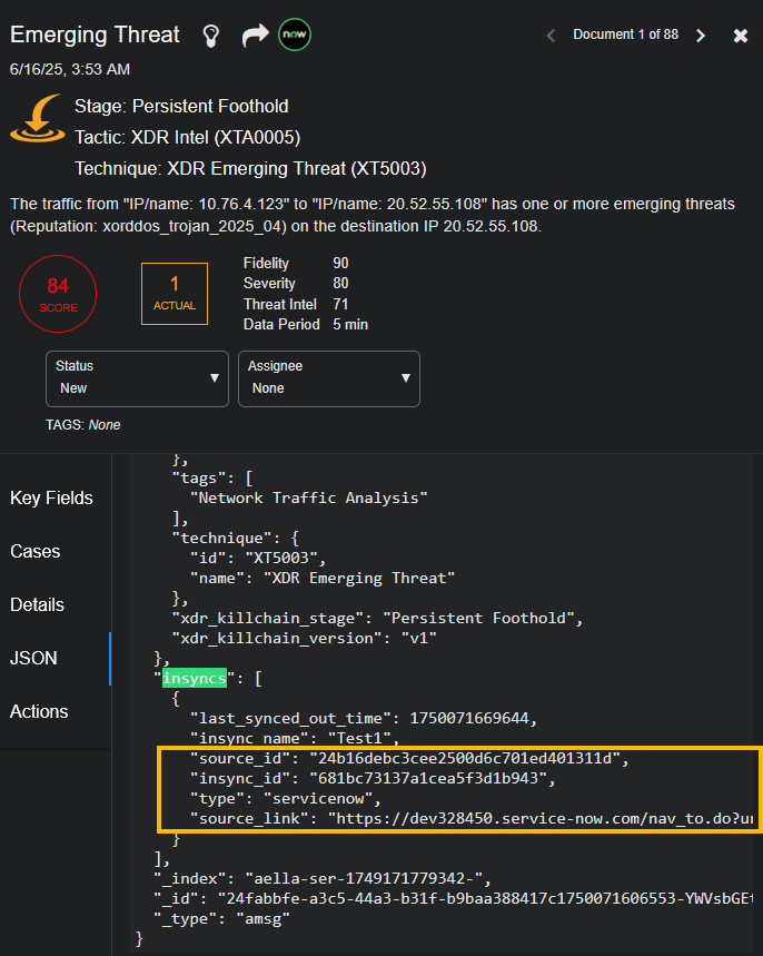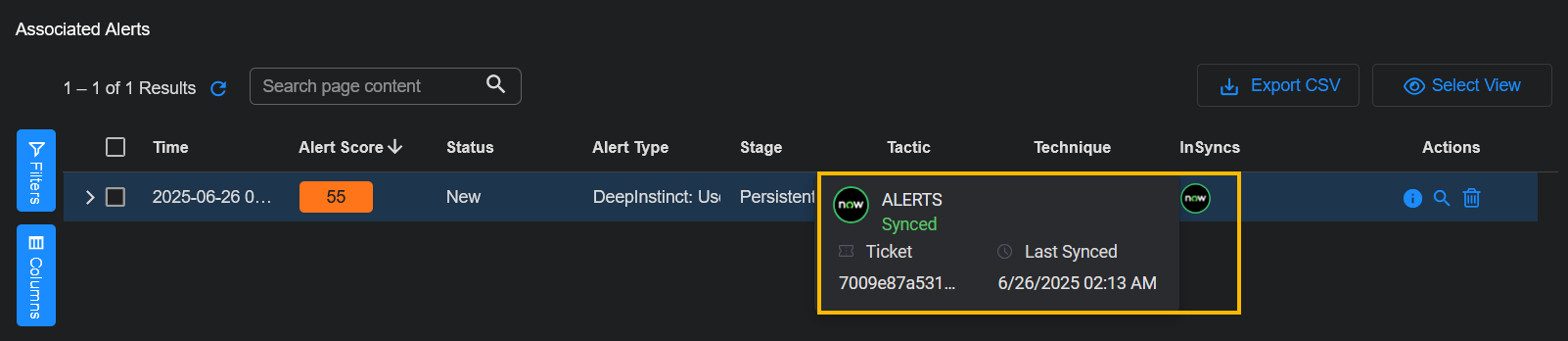 You can scroll to the bottom of the Case Details page to see the Associated Alerts table with a separate row for each alert associated with the case. The table has an InSyncs column showing the alert that has been synced. When you hover over a NOW icon in the InSyncs column, the status, Ticket ID, and Last Synced date and time are displayed.
