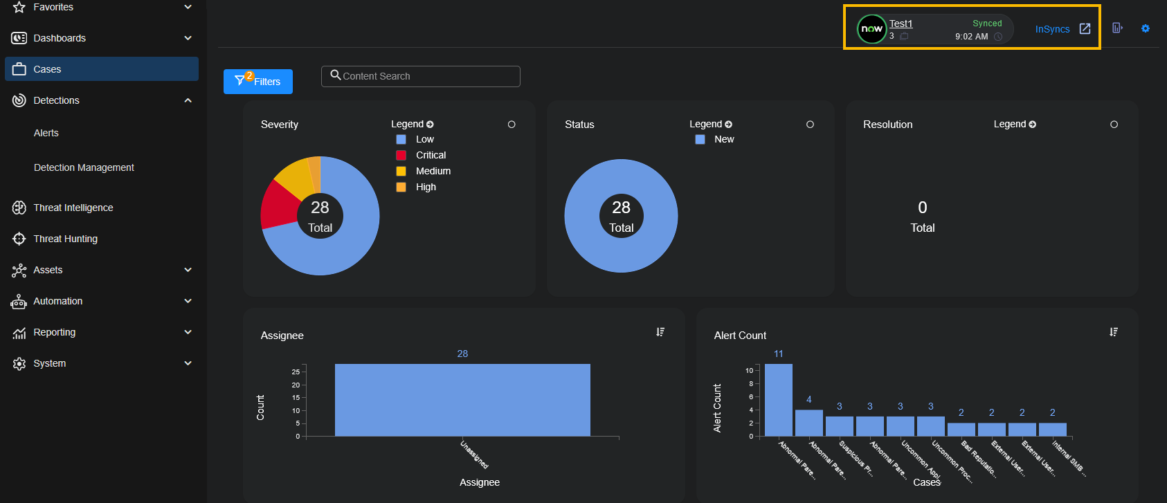 In each indicator, the name of the InSync is listed. There is a count of the number of alerts that have been synced using this InSync and a timestamp of the last synchronization.