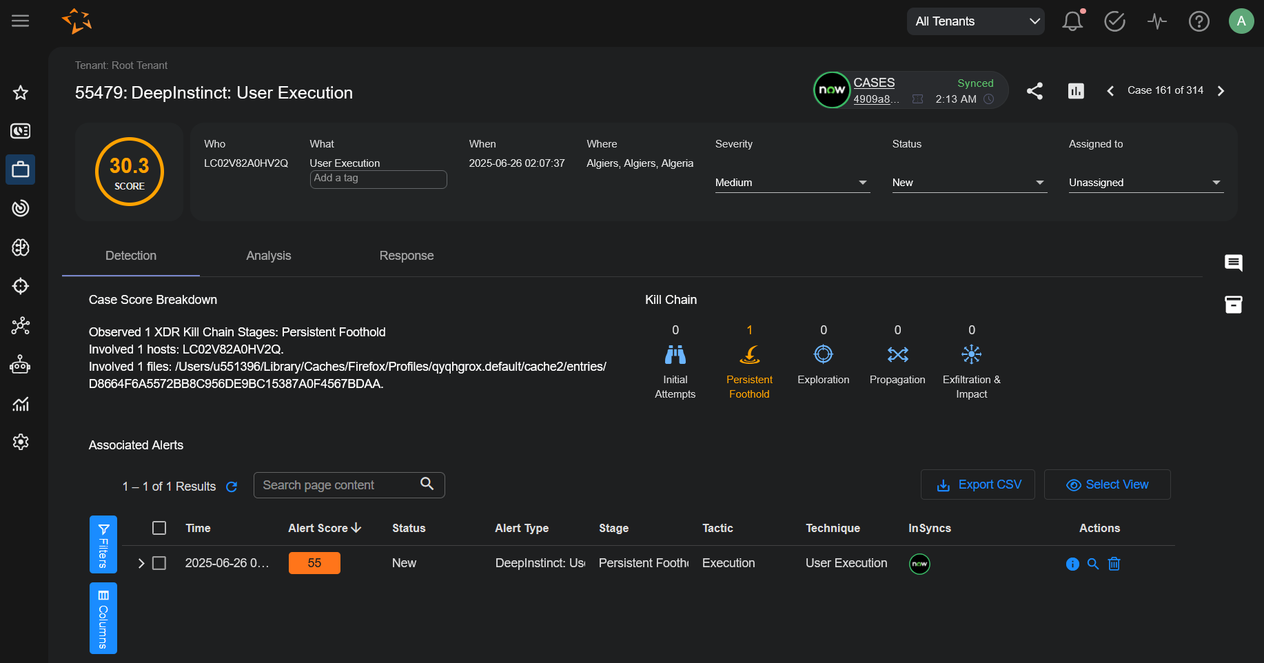 In the Case Details page, the manual Sync to ServiceNow button is visible when an alert cannot be synchronized to any InSync configuration automatically.