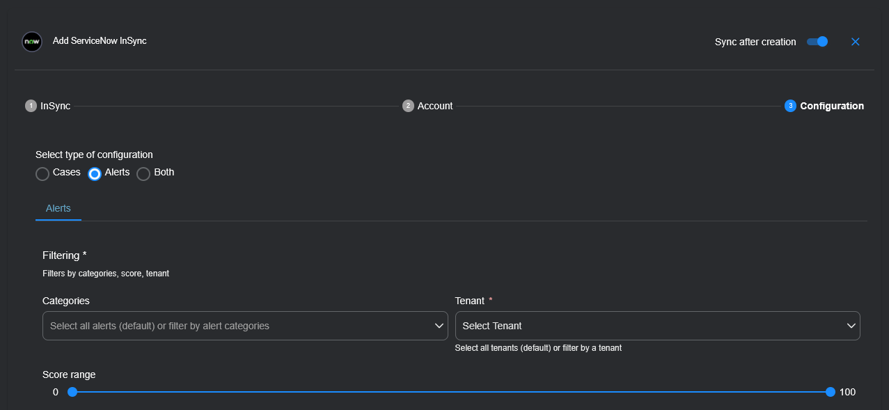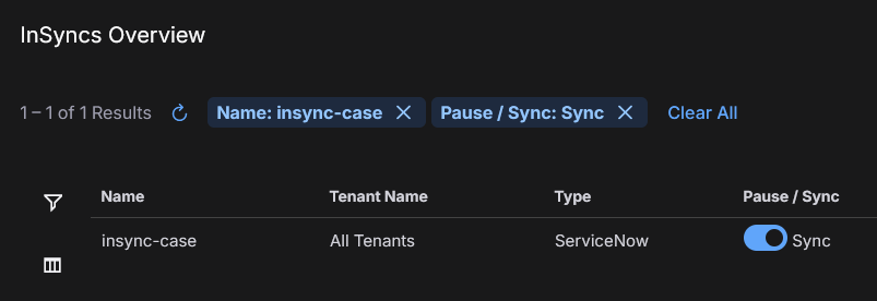 You can create up to three InSyncs. During the configuration, you will authenticate the user with ServiceNow, select the type of integration sync (alerts, cases, or both), and provide the name of a ServiceNow alert database table, case database table, or both.